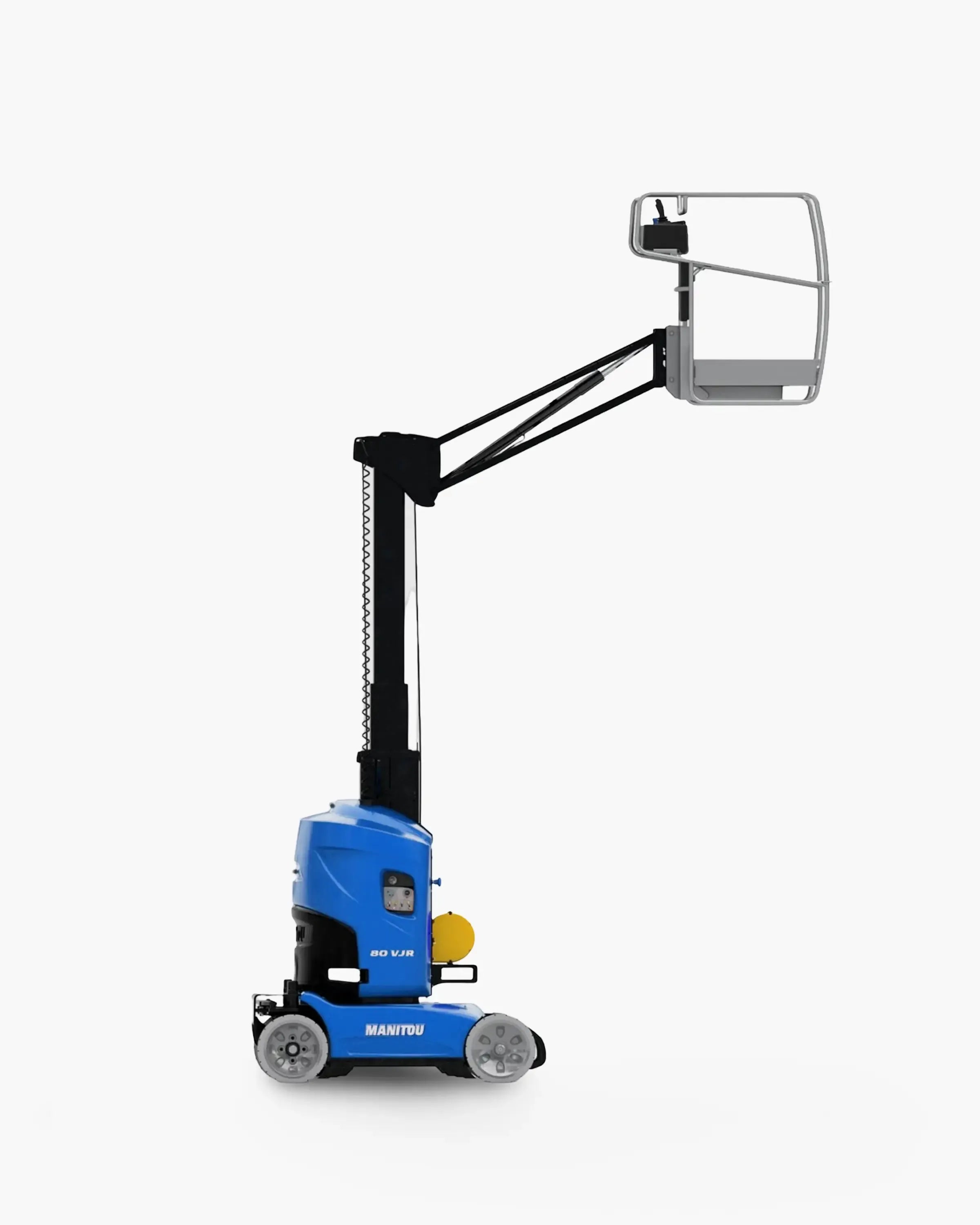 Manitou 80 VJR je obratná, elektricky poháněná stožárová pracovní plošina pro přesnou práci ve výškách, a to jak v interiéru, tak i exteriéru. S pracovní výškou 7,65 m a bočním dosahem 3,20 m umožňuje přístup do těžko dostupných míst – ideální pro údržbu, montáž nebo instalaci ve stísněných prostorech.