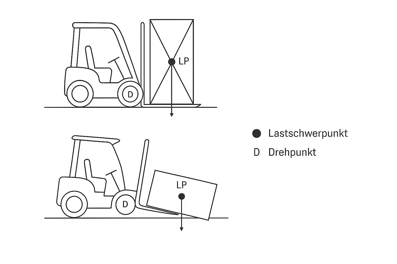 As soon as the actual center of gravity is further forward or the lifting height increases, the load capacity must be reassessed – otherwise an unstable condition threatens.